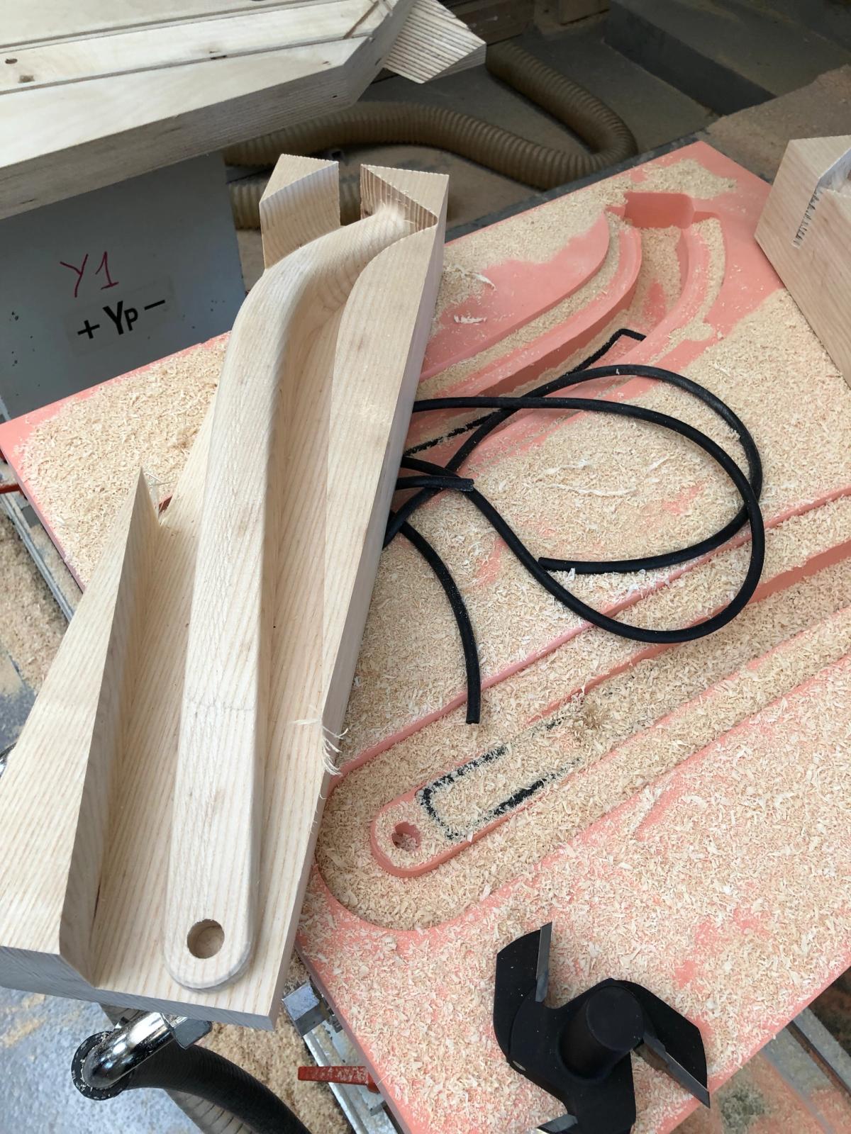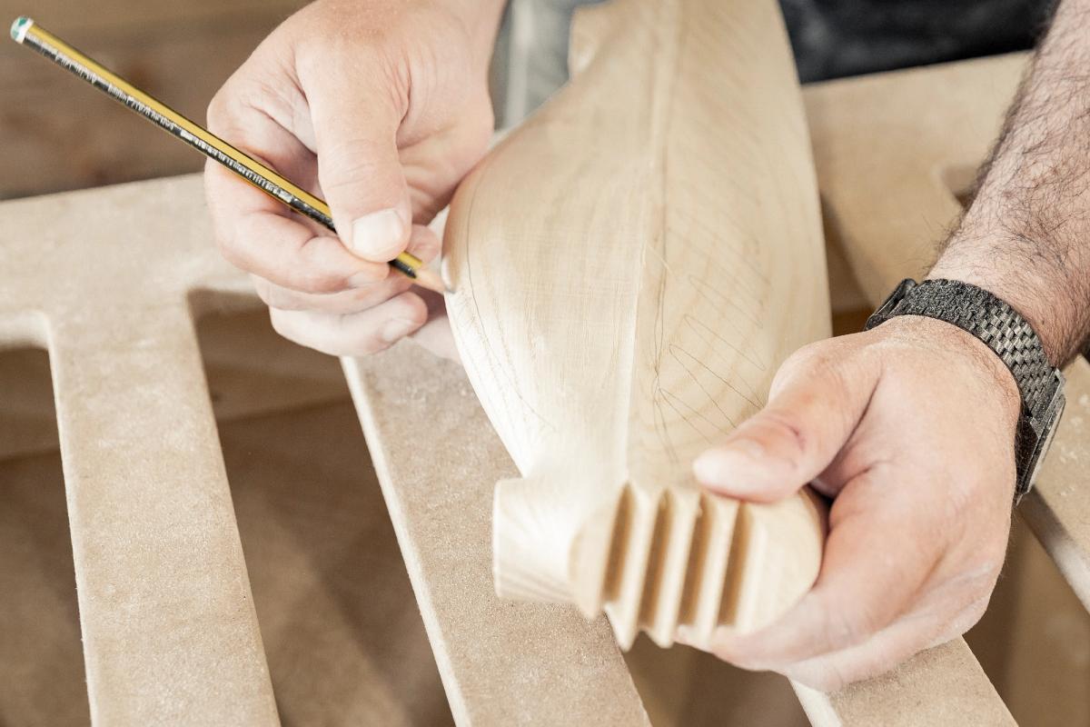 The smooth seat upholstery made with quality leather and the all-in-one backrest inspired by beach pebbles combine to offer an embracing and comfortable seating experience. The backrest, which gives the chair its unique character, is crafted using both modern CNC milling and traditional woodcraft techniques. The backrest and slender wood-turned legs are seamlessly joined.