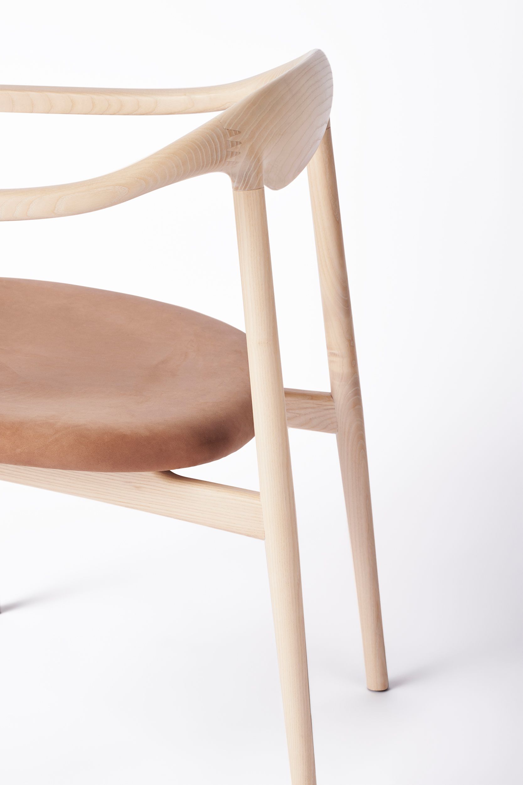 The smooth seat upholstery made with quality leather and the all-in-one backrest inspired by beach pebbles combine to offer an embracing and comfortable seating experience. The backrest, which gives the chair its unique character, is crafted using both modern CNC milling and traditional woodcraft techniques. The backrest and slender wood-turned legs are seamlessly joined.